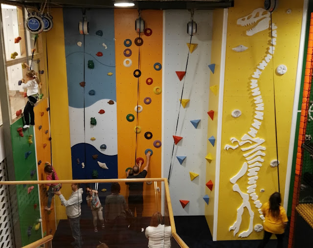 Atrakcje. Instalacje raczej typowe za to jest ich faktycznie dużo i na kilku poziomach. Do tego ścianka wspinaczkowa i oddzielne pokoje przyporządkowane konkretnym jubilatom (w czasie naszego pobytu odbywały się co najmniej cztery niezależne imprezy urodzinowe). Na górze kącik maluszka, dla najmniejszych, gdzie bawią się pod czujnym okiem rodziców (ci ostatni mogą obserwować przebieg wydarzeń z kawiarnianych stolików). Ponadto organizatorzy oferują różnorakie zajęcia cykliczne i warsztaty, typu robotyka, rytmika, itp. Nasze dzieci jak tylko weszły od razu przepadły w czeluściach siatek, kulek, materacy i zjeżdżalni.