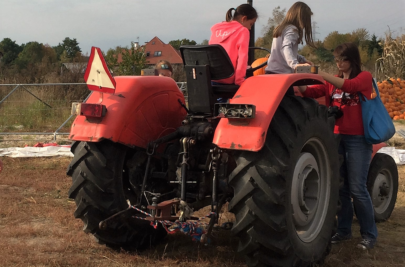 W tej sumie jest wszystko, już bez dodatkowych dopłat za atrakcje. A konkretnie- labirynt ze słomy, mini ZOO, gdzie można karmić zwierzaki kukurydzą własnoręcznie zerwaną „z krzaka”, a do zagrody w królikami maluszek może również wejść; trampolina; traktor (kto by pomyślał, że zdjęcie na traktorze może być tak atrakcyjne dla dzieci), a także dynia do wyboru- w cenie biletu, za niektóre (cięższe) trzeba dopłacić, bo liczy się „na wagę”.