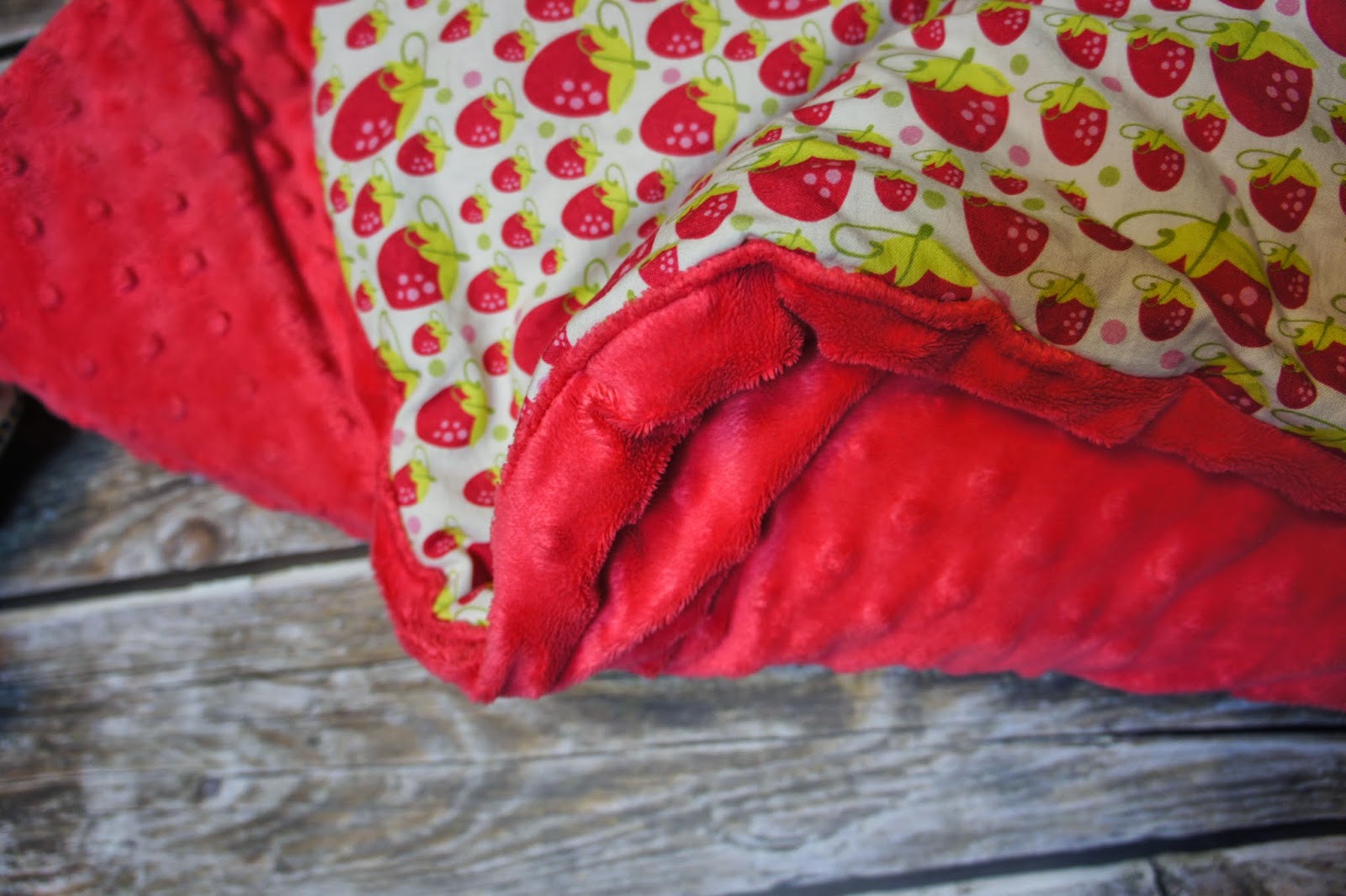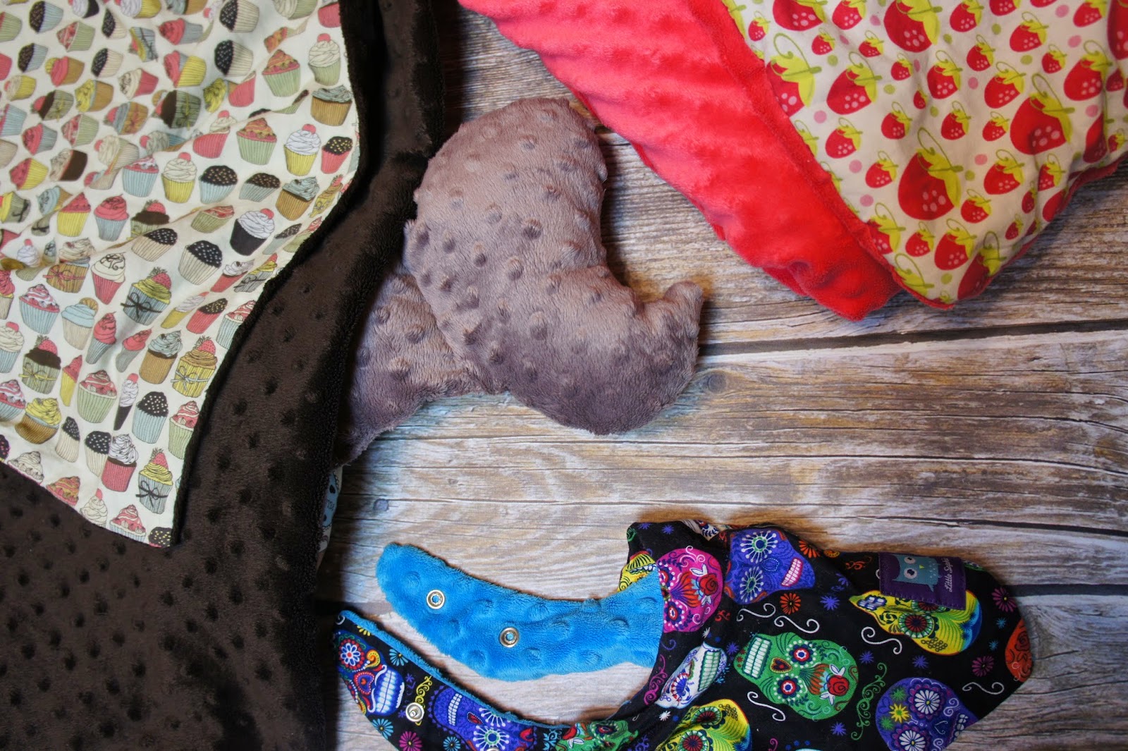 Do rzeczy. Materiał jest jednostronny, dość cienki, więc można zszyć ze sobą dwa, jeśli potrzebna jest struktura dwustronna albo dodać jeszcze do środka jakiś wkład, jeśli chcemy grubszy kocyk czy kołderkę. Często, jak widzę, łączony z bawełnianą „drugą stroną”, która przeważnie jest wzorzysta. Bo minky jest jednokolorowe. Przynajmniej ja nie widziałam wielobarwnego, a szukałam, być może wynika to z techniki produkcji. Natomiast jest też minky welur i polar minky i te są dostępne kolorowe, w przeróżne wzorki.