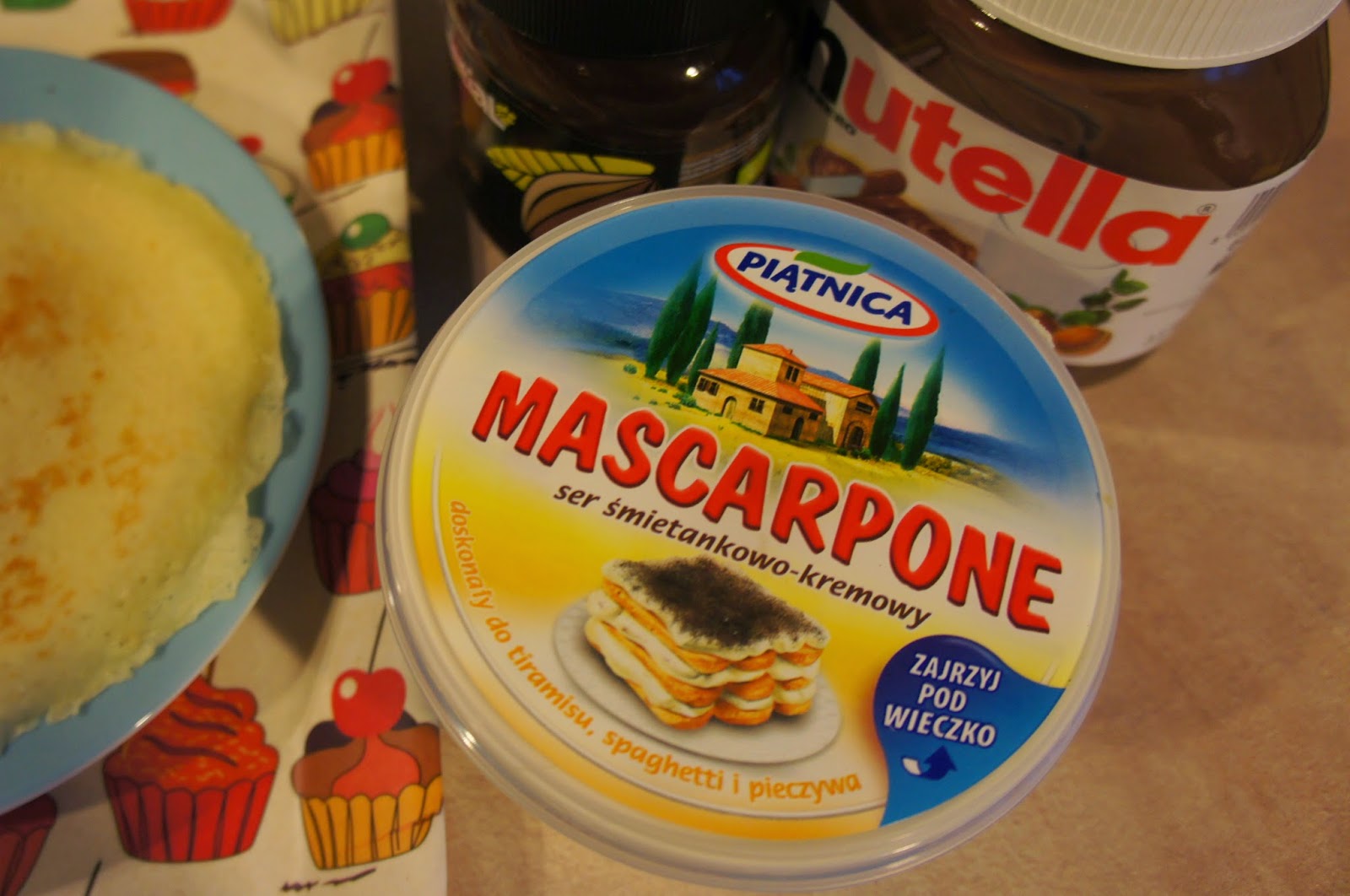 Gotowe naleśniki smarujemy dowolnymi składnikami- tym razem- mascarpone ze „słodką nutą”: do wyboru Nutella, organiczna czekolada (na górze zdjęcia), był jeszcze eko-dżem wiśniowy, ale nie załapał się do zdjęcia grupowego 😉 Mascarpone lubię Piątnicy, ma jeden defekt- fatalne zamknięcie 🙁 Nutella- firma znana, a organiczna czarna czekolada- Essential.(kupuję z Grupą Solidarnych Zakupów).
